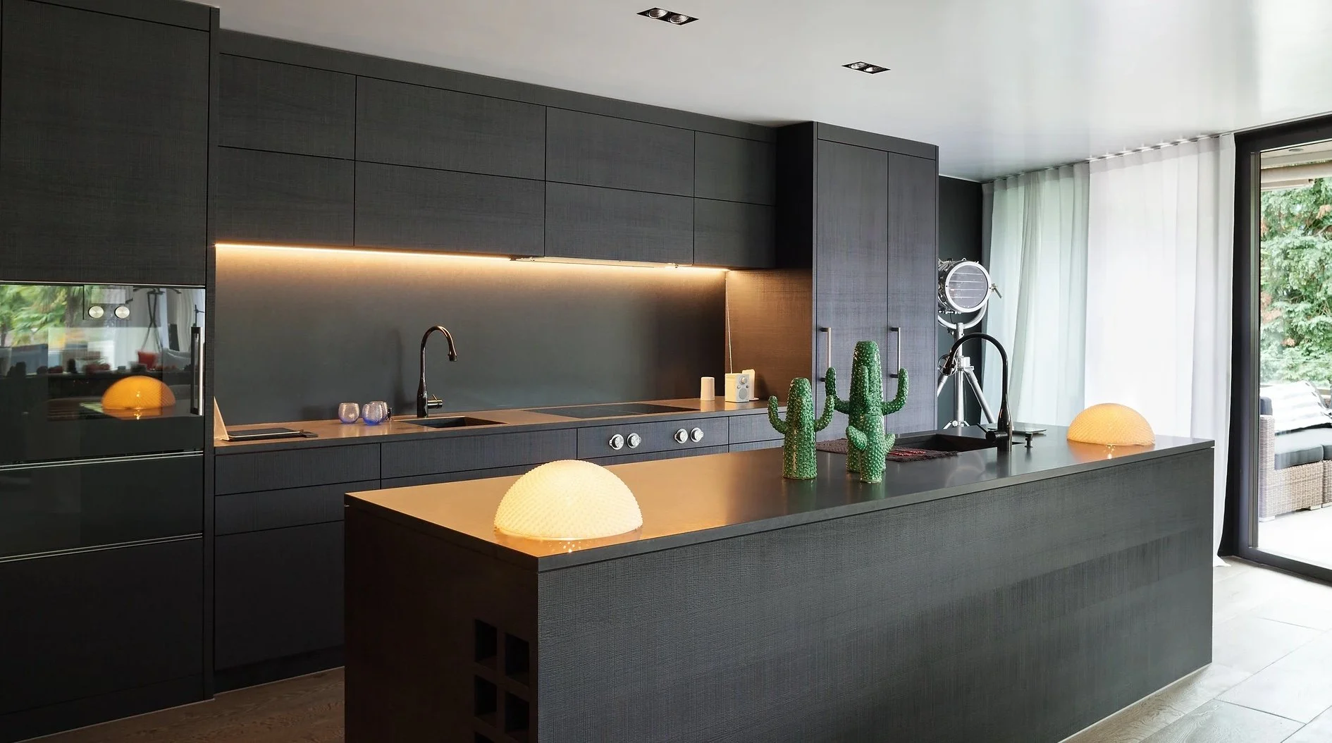 Vi leverer bak- og sideplater til kjøkken i glass med hullfester, aluminiumslister eller rene glass - og plater i kompositt som limes/fuges direkte på veggen.